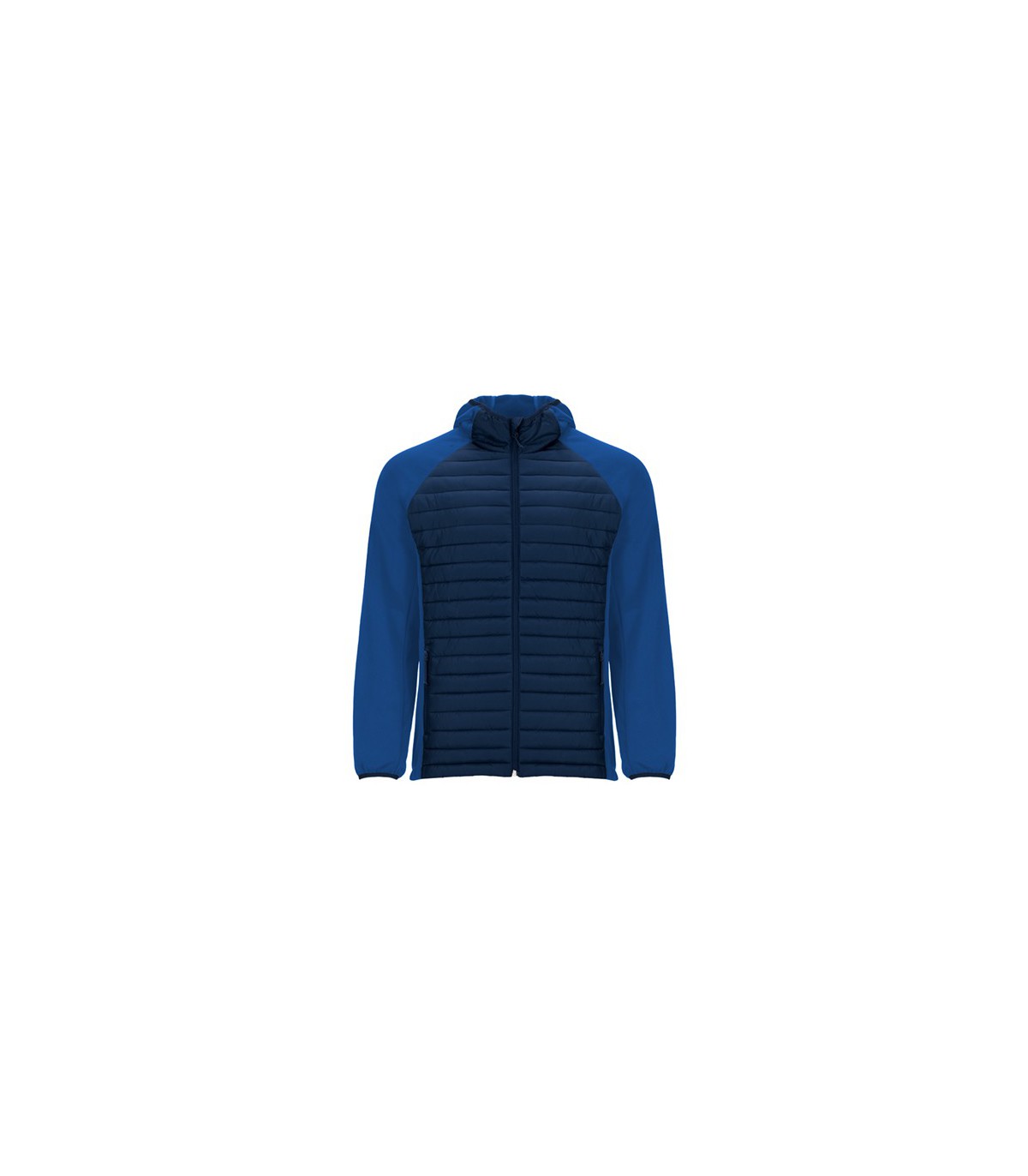 Chaqueta de hombre combinada en dos tejidos: 1. Capucha fija ajustada. 2. Manga estilo ranglán. 3. Tejido softshell en mangas, paneles laterales y capucha. 4. Tejido acolchado tacto pluma en frontal y espalda. 5. Cremallera invertida a tono con protector de barbilla y tirador. 6. Dos bolsillos frontales con cremalleras. 7. Ribete elástico a tono en cuello, puños y bajo.