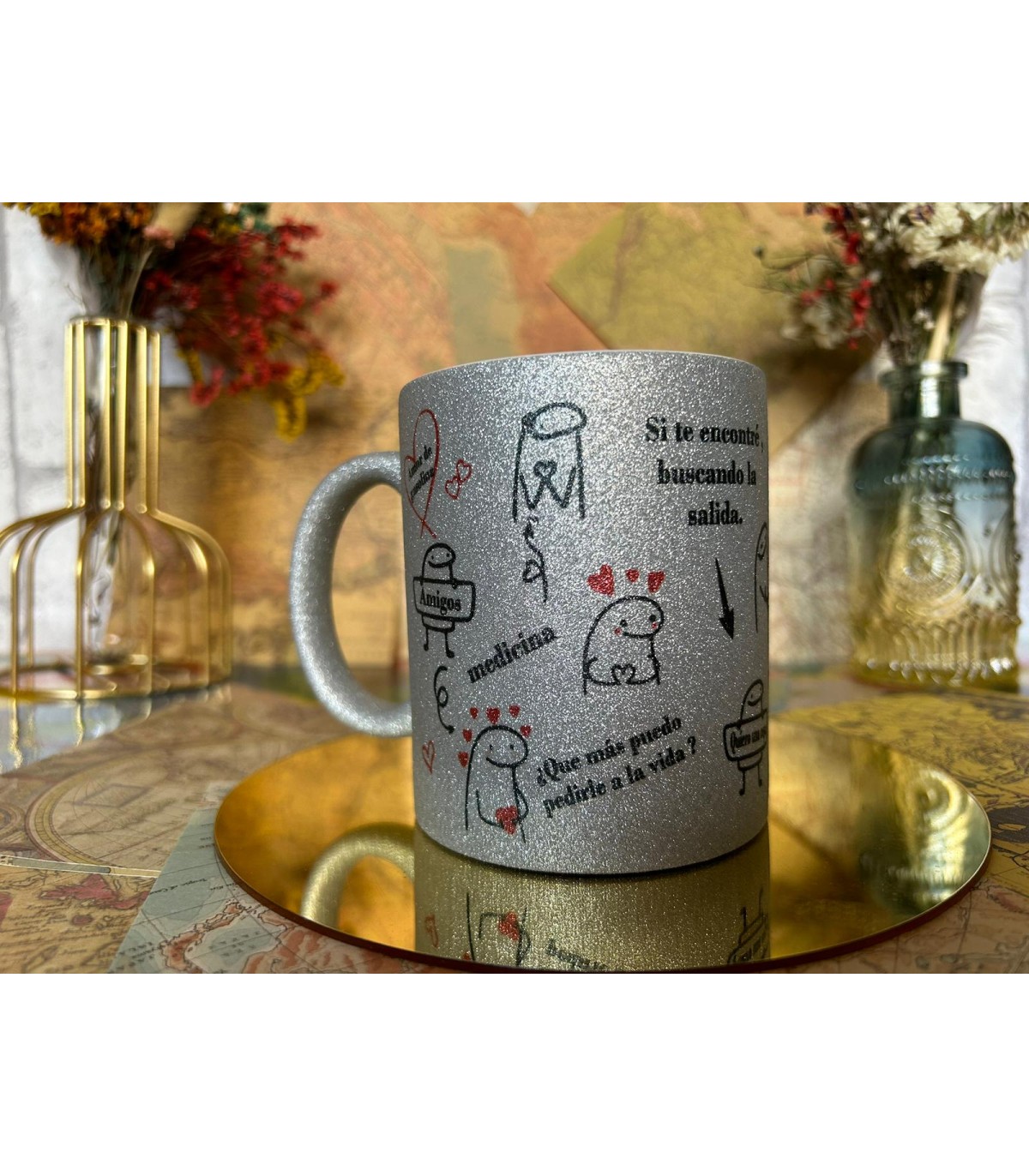 Taza de cerámica con 350 ml de capacidad. Original cobertura efecto purpurina. Presentada en caja individual kraft.