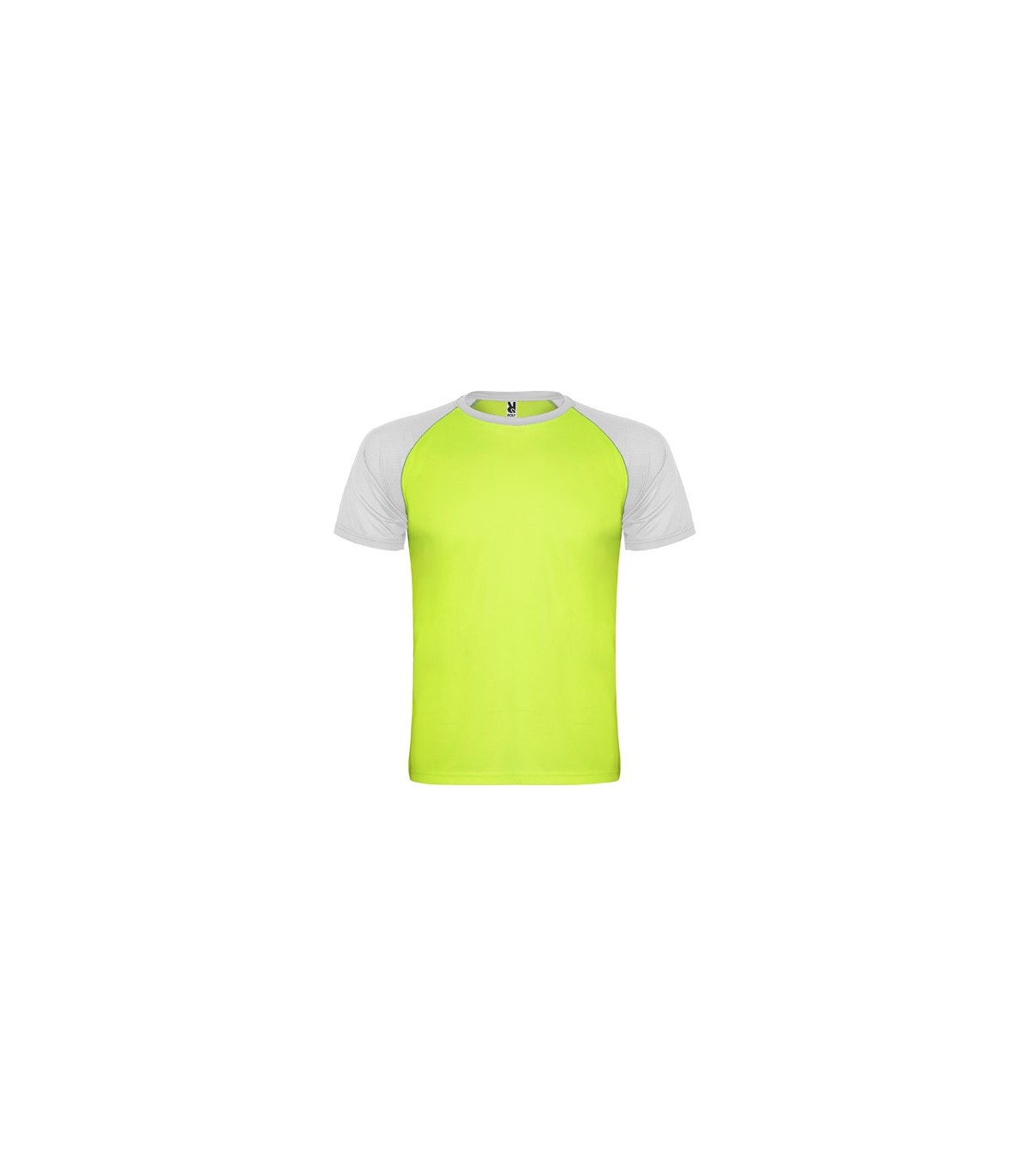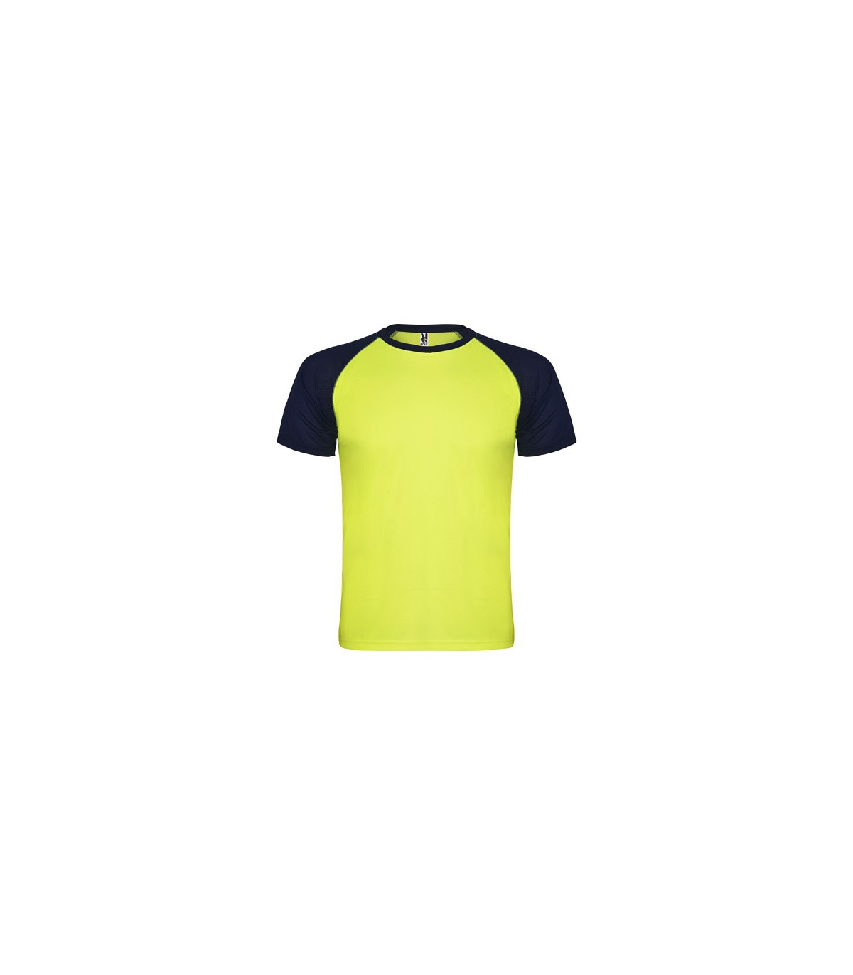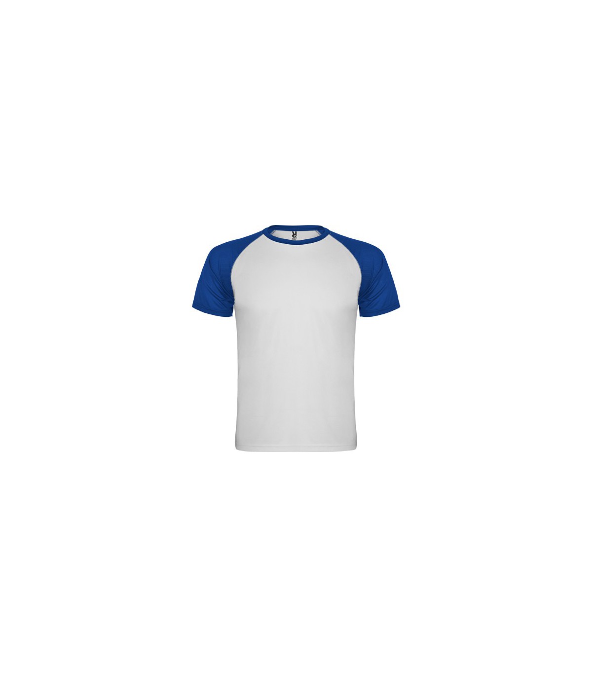 Camiseta deportiva de manga corta estilo ranglan en contraste. Cuello redondo en contraste con cubrecosturas de refuerzo en su interior.