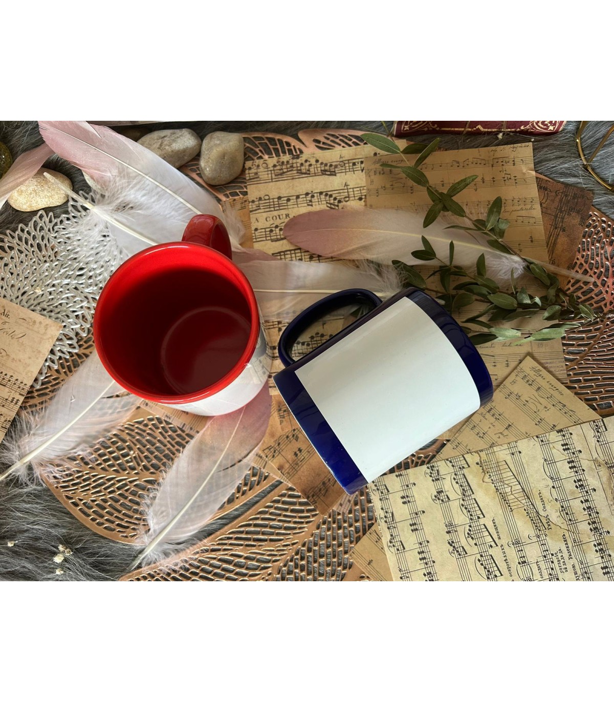 Taza de cerámica con interior en color rojo o azul, totalmente personalizada.